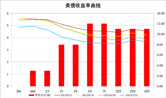 2、9月21日,美联储9月FOMC宣布维持联邦基金利率目标区间在5.25%-5.5%不变,符合预期,但经济预测与点阵图偏鹰。19名官员中有12名预计今年还会再次加息,此前市场预期为10人。预估中值显示,政策利率将在2024年底降至约5.1%,6月预测值4.6%,意味着明年降息空间从100bp降到50bp。经济预测(SEP)方面,上调了今年的经济增长预期,2023至2025年底美国GDP增速预期中值分别为2.1%、1.5%、1.8%。(6月预期分别为1.0%、1.1%、1.8%),下调了2023年失业率预期至3.8%,上调2023年PCE通胀预期至3.3%。鲍威尔会后发言偏鹰,称中性利率可能更高。会后美股、黄金大幅走低,而美债利率上行,市场定价有一半可能性再度加息25bp,最快明年9月降息。
