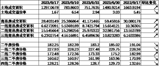 地产数据方面,政策出台后二手房价格及土地成交溢价率有所回落,不过商品房成交面积有所回升,上周地产数据有所回暖。