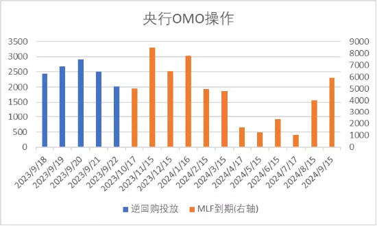 上周央行OMO投放12560亿,同时到期7040亿,共计净投放5520亿。MLF9月到期4000亿后等价续作5910亿,净投放1910亿。