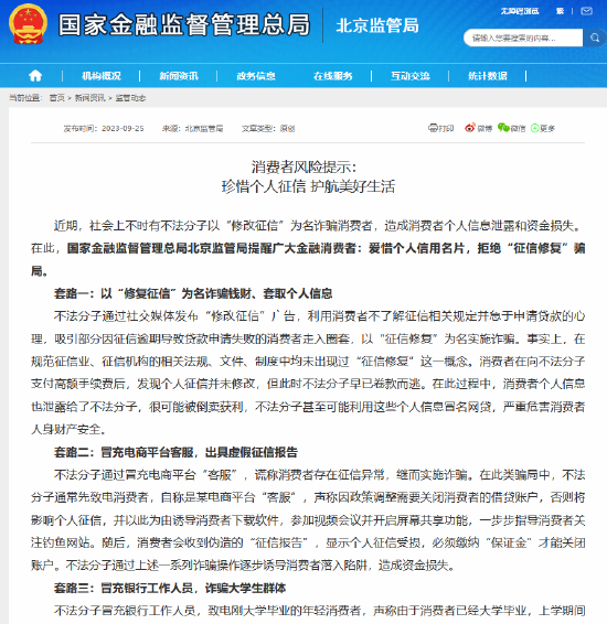 9月25日金融一线消息,国家金融监督管理总局北京监管局发布风险提示《消费者风险提示:珍惜个人征信 护航美好生活》。提示表示,近期,社会上不时有不法分子以“修改征信”为名诈骗消费者,造成消费者个人信息泄露和资金损失。因此,国家金融监督管理总局北京监管局以风险提示提醒广大金融消费者:爱惜个人信用名片,拒绝“征信修复”骗局。
