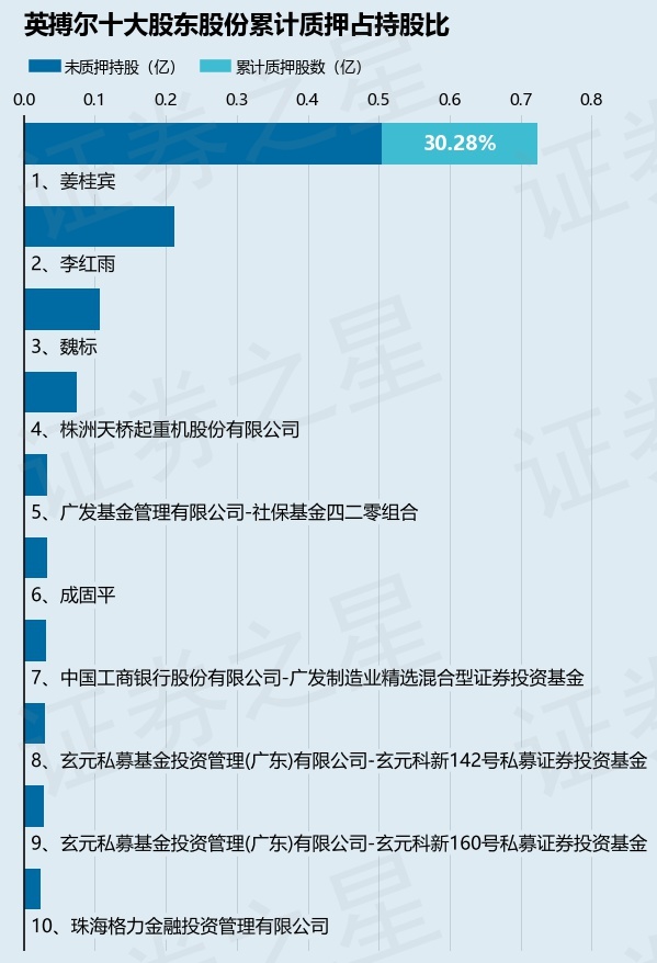 截止本公告日,股东姜桂宾已累计质押股份2191.93万股,占其持股总数的30.28%。本次质押后英搏尔十大股东的累计质押股份占持股比例见下图: