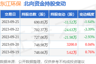 9月25日北向资金减持11.52万股东江环保。近5个交易日中,获北向资金减持的有3天,累计净减持52.19万股。近20个交易日中,获北向资金减持的有11天,累计净减持280.61万股。截至目前,北向资金持有东江环保690.85万股,占公司A股总股本的0.63%。