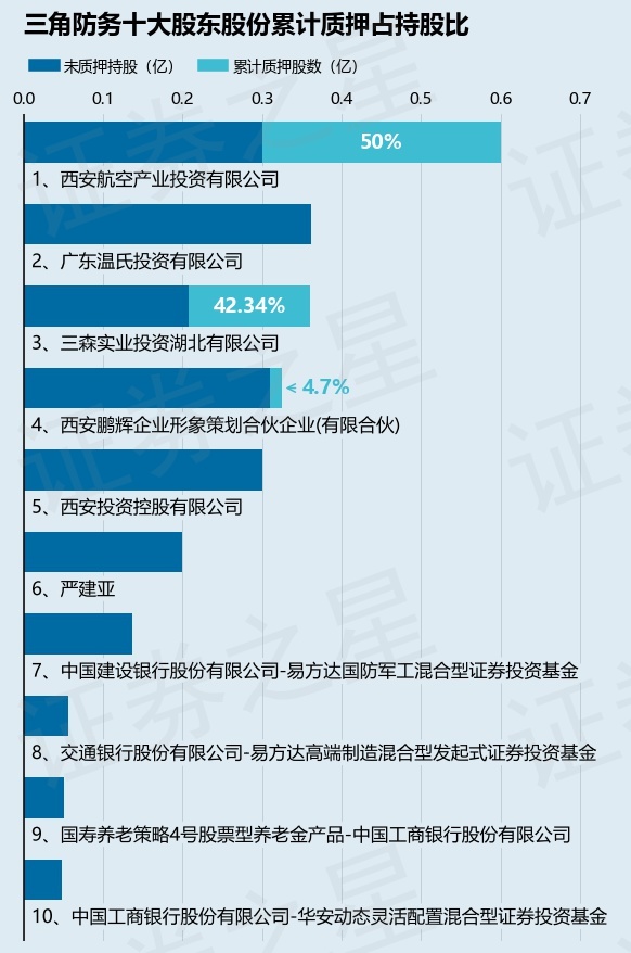 截止本公告日,股东西安航空产业投资有限公司已累计质押股份3000.0万股,占其持股总数的50.0%,股东三森实业投资湖北有限公司已累计质押股份1526.0万股,占其持股总数的42.34%,股东西安鹏辉企业形象策划合伙企业(有限合伙)已累计质押股份153.0万股,占其持股总数的4.7%。本次质押后三角防务十大股东的累计质押股份占持股比例见下图: