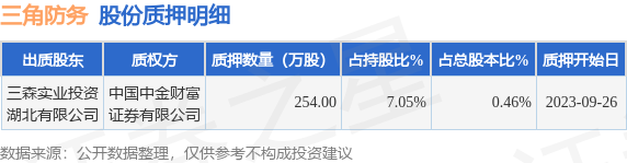 三角防务(300775)9月26日公开信息显示,股东三森实业投资湖北有限公司向中国中金财富证券有限公司合计质押254.0万股,占总股本0.46%。质押详情见下表: