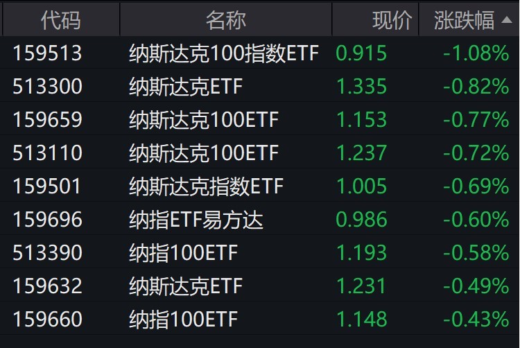 目前场内有9只ETF跟踪纳斯达克100指数,其余8只跌幅在1%以内。
