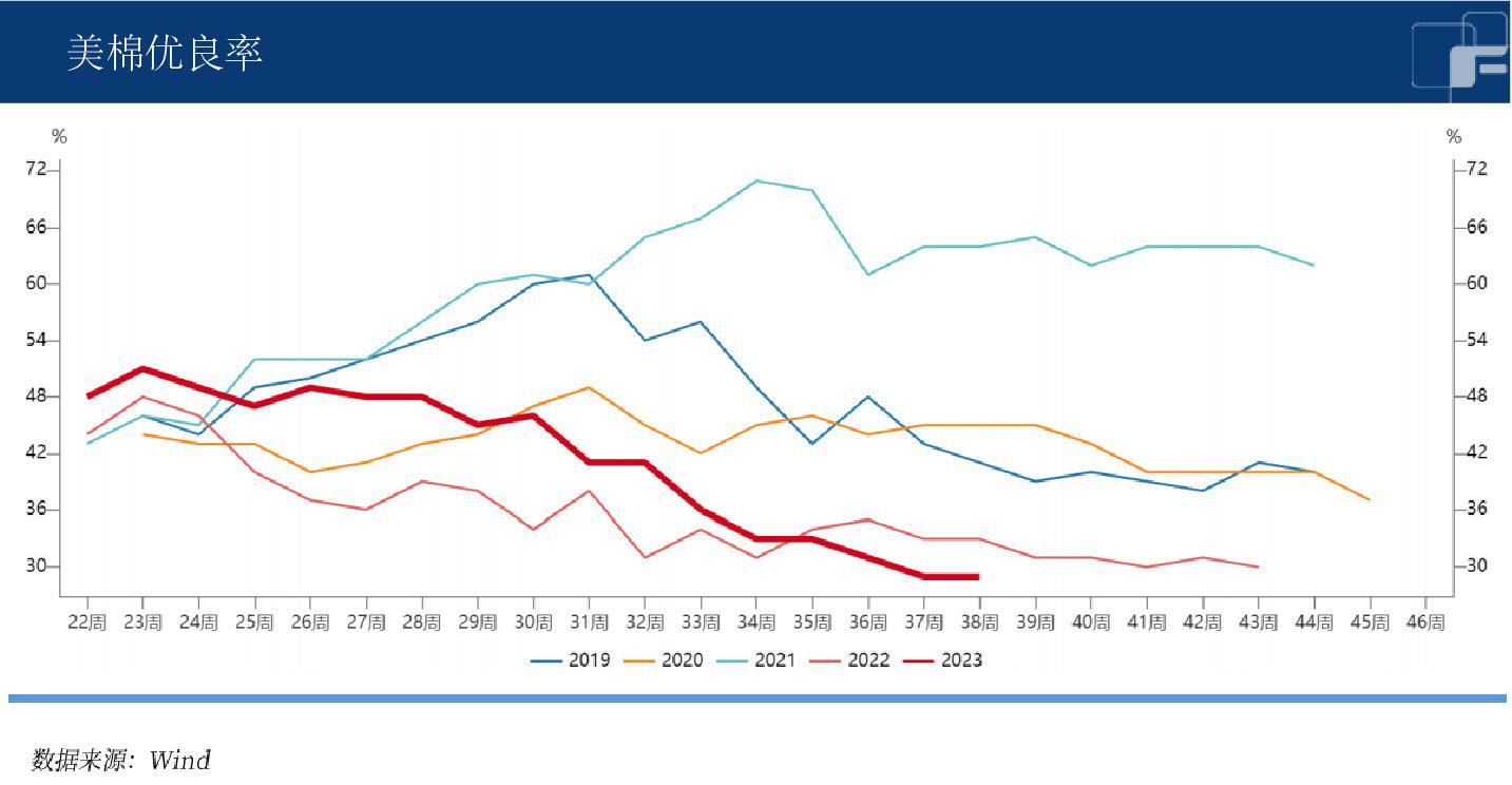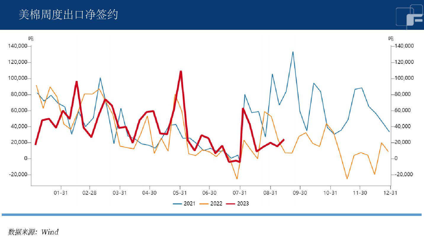 国内市场,2023年新疆棉花产量可能在542万吨左右,减产不及预期。开秤临近又逢低温降雨,抢收存在分歧。同时抛储或将持续到10月底,预计抛储成交可能达到约90万吨。9月开始配额进口货到港量大幅增加,完全逆转之前供给紧张的格局,政策利空超预期。