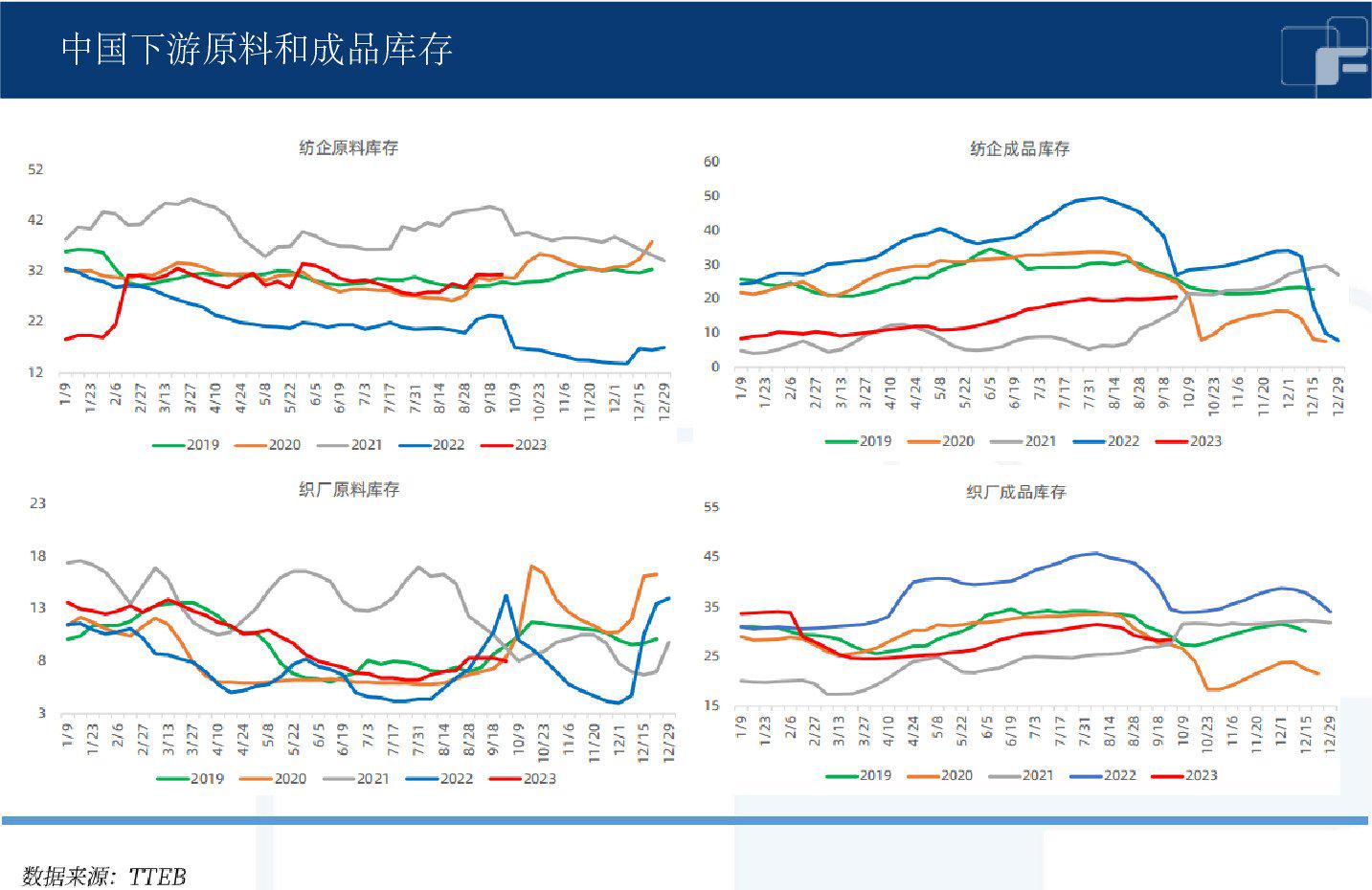 需求端旺季不旺。“金九银十”旺季预期可能落空,纺企开机仍有下降,棉纱价格阴跌,内地纺企纺纱利润亏损,成品库存增加,原料库存增加。布厂开机下降,成品库存增加,原料库存下降。下游旺季不旺,负反馈持续。