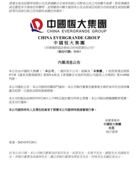 9月28日,中国恒大在港交所公告,本公司接到有关部门通知,本公司执行董事及董事会主席许家印先生因涉嫌违法犯罪,已被依法采取强制措施。本公司的股份由2023年9月28日上午9时正起于联交所停止买卖。本公司股份将继续暂停买卖,直至另行通知。