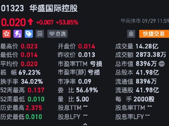 华盛国际控股暴涨近54%,报0.02港元,该股盘中一度涨超76%。消息上,华盛国际控股发布公告称,公司董事会关注到于2023年9月28日,公司股份价格下跌及成交量上升。 公告称,公司执行董事、董事会主席兼行政总裁黄伟昇先生知会董事会,因股价大幅下跌,双星环球有限公司及黄先生所持股份(共占公司已发行股本总额约20.18%)于2023年9月28日被双星及黄先生的股票经纪在市场上强制出售。紧随强制出售完成后,双星及黄先生于公司的权益百分比均减少至公司已发行股本总额约5.81%。