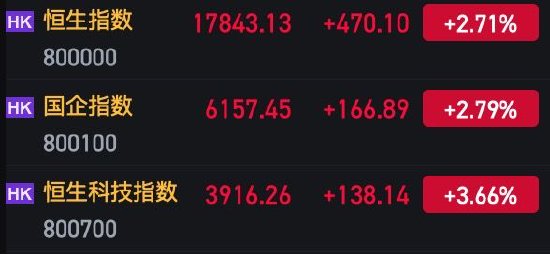 9月29日消息,美股周四先跌后回升,美债息持续向上,影响大市早段表现,其后低位回稳,并倒升收市,三大指数均录得温和升幅。美元高位回落,美国十年期债息回落至4.57厘水平,金价及油价表现受压。港股今日高开高走,截至午间收盘,恒指涨2.71%,报17843.13点,恒生科技指数涨3.66%,国企指数涨2.79%。盘面上,大型科技股普涨,美团涨近4%,腾讯控股涨近3%;内房股持续走强,旭辉控股集团涨近9%,龙湖集团、碧桂园等跟涨;汽车股集体活跃,三大新势力集体上扬,蔚来、小鹏涨近9%;昨日活跃的医药股有所调整。