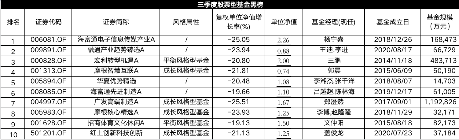 黑榜上的10只股基三季度收益率近乎全数跌破20%。其中,海富通电子信息传媒产业A跌幅最大,亏损了25.05%。其次是融通产业趋势臻选A,亏损了23.94%,该基金净值破“1”,为0.88元。净值同样破“1”的还有摩根智慧互联A。