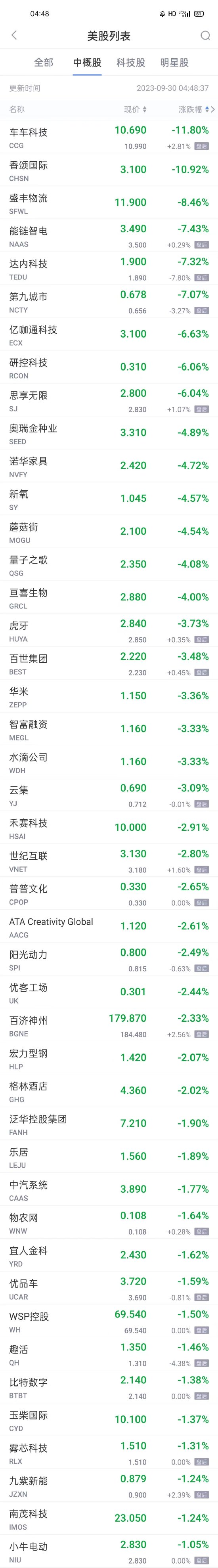 车车科技跌超11%,盛丰物流跌超8%,能链智电跌超7%,亿咖通科技、思享无限跌超6%,新氧、量子之歌、亘喜生物跌超4%,虎牙、水滴公司跌超3%,禾赛科技、世纪互联、百济神州、格林酒店跌超2%,优品车、WSP控股、比特数字、雾芯科技、小牛电动跌超1%,小赢科技跌近1%。