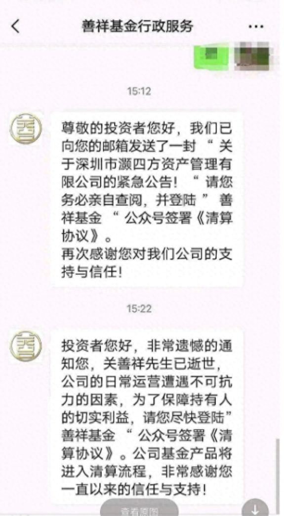 9月29日,私募圈突然传出一则噩耗——善祥基金行政服务的人提示:善祥基金董事长关善祥已逝世,请投资者尽快登录“善祥基金”公众号,公司基金产品将进入清算流程。