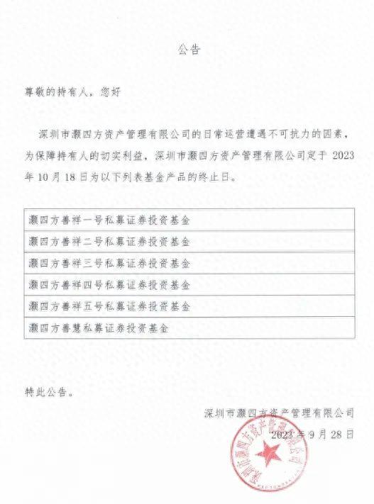 记者登录深圳市灏四方资产管理有限公司官网发现,就在前一天(9月28日),公司发布公告称,深圳市灏四方资产管理有限公司的日常运营遭遇不可抗力的因素,为保障持有人的切实利益,深圳市灏四方资产管理有限公司定于2023年10月18日为部分基金产品的终止日,而这一系列基金产品包括灏四方善祥基金1-5号产品和灏四方善慧产品。