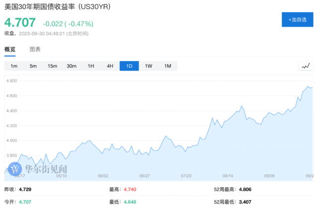 根据道琼斯市场数据,自7月1日起的第三季度以来,长期债券收益率已上涨87.5个基点,有望在周五该季度交易结束时创下1987年以来的最大季度涨幅,近期交易价格为4.707%。