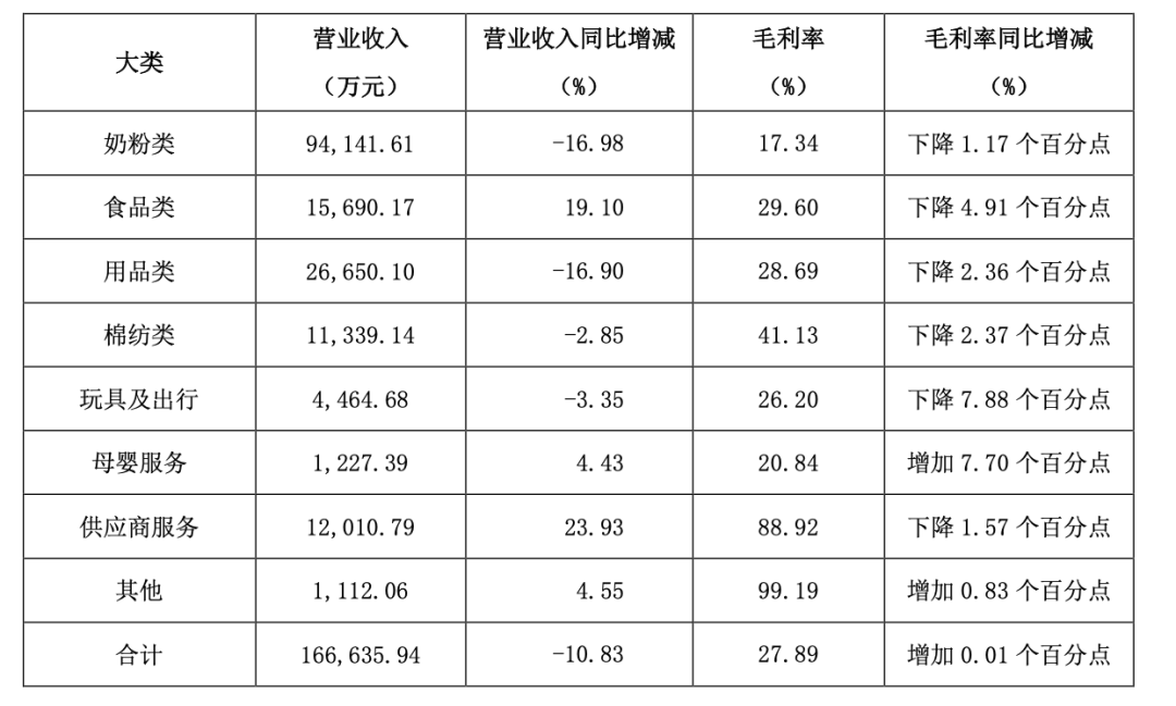结合业务来看,母婴室经营业务包括奶粉、食品、用品、棉纺、玩具及出行、母婴服务、供应商服务等,值得注意的是,公司最大的两个业务板块均出现营收大幅下滑情况。