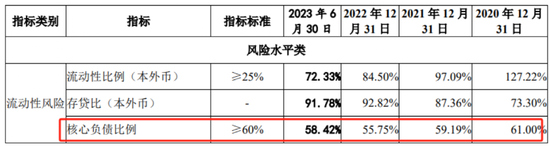 首先是“核心负债比例”,报告期内公司该指标持续低于监管要求,最新值为58.42%。核心负债比率是流动性风险监管指标衡量内容之一,是指核心负债与负债总额之比,分别计算本外币和外币口径数据,不得低于60%。