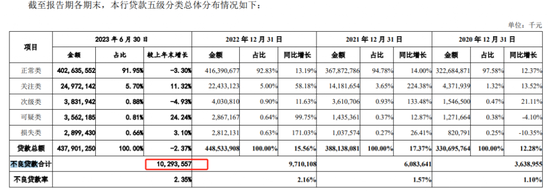 截至报告期各期末(2020年至2023年上半年),该行不良贷款率分别为 1.1%、1.57%、2.16%和2.35%,最新的不良率已经是A股上市城商行平均不良率的2倍多,金额突破百亿,达103亿元,为去年净利润(33.39亿元)的3倍不止。其中,其房地产行业不良贷款上升较快,最新的前十大不良客户四家来自房地产行业。
