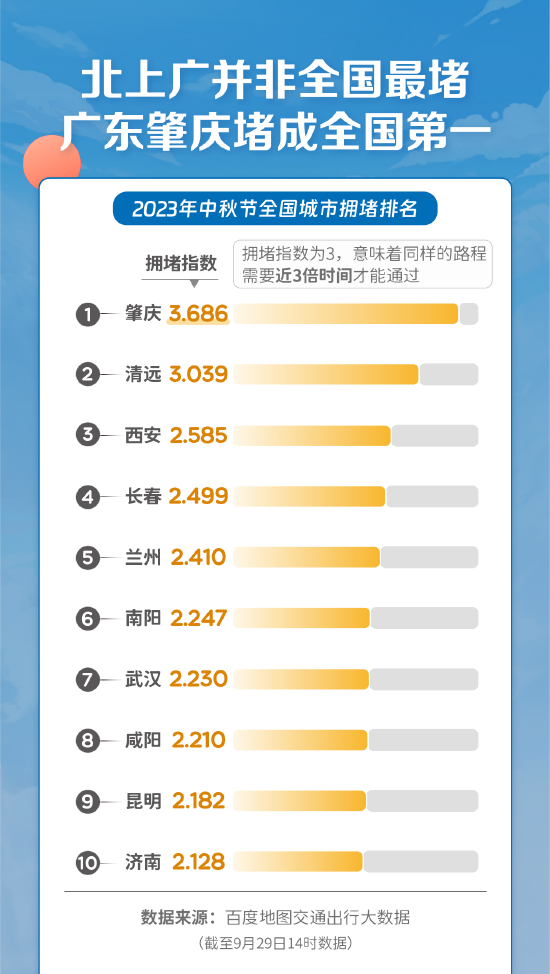 城市拥堵方面,广东肇庆、清远位居全国前二,拥堵指数均破3。意味着同样的路程,需要比平时超3倍时间才能通过,显示出大湾区节假通勤的交通压力。而陕西西安,也凭借2.5的拥堵指数,成为北方当前拥堵城市代表。北上广深等一线城市,其拥堵程度并未进入全国前十。
