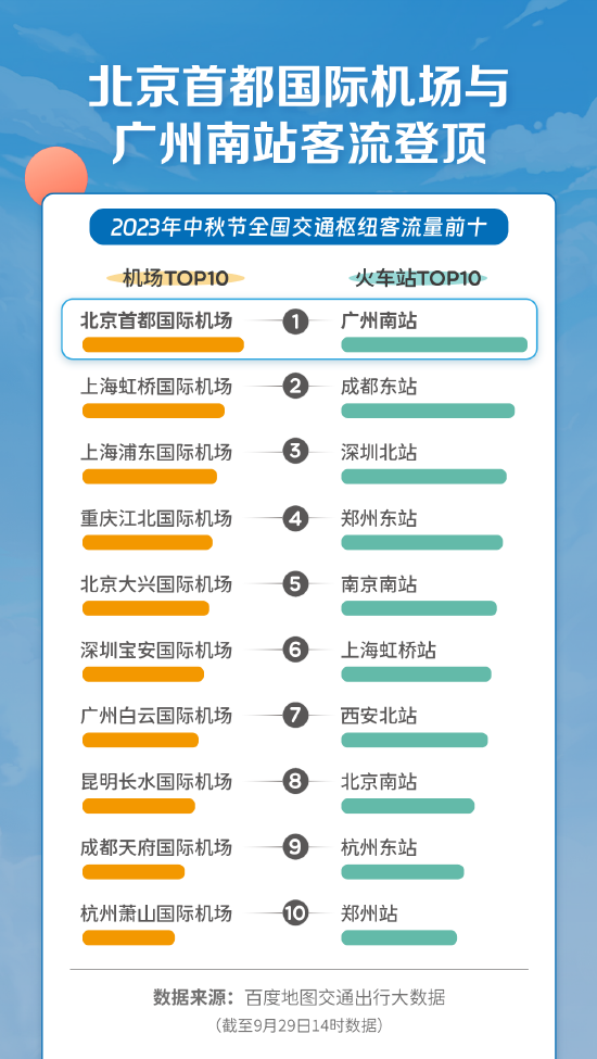 根据百度地图发布交通枢纽热度数据,广州南站、成都东站与深圳北站客流指数最高,远超全国火车站平均水平,显示出旺盛的出行需求。机场客流中,北京首都国际机场今日客流量最大,位居全国机场第一,“人从众”景象显著。