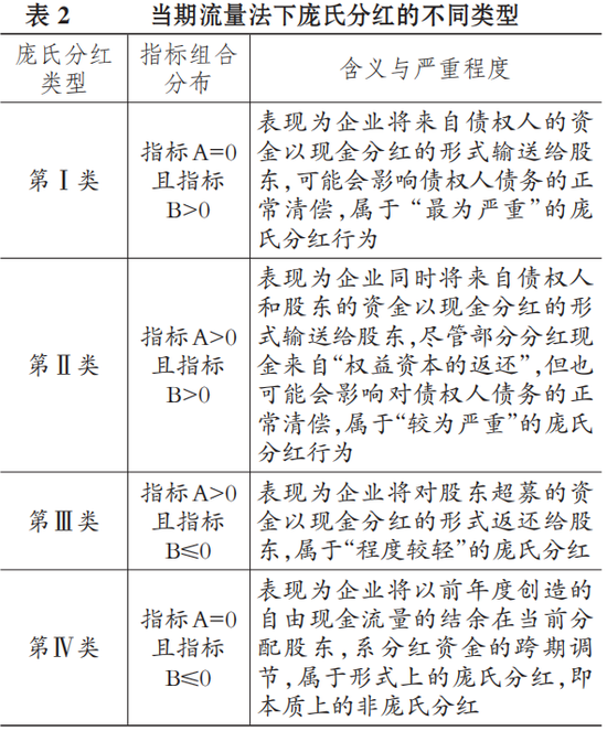 2. 建议监管部门在指导上市公司现金分红决策时,着重关注现金分红是否侵害债权人的利益,可以结合当期现金流量法来追溯分红现金之来源,以免出现“损债权人—肥股东”的情况,从而有力保护债权人权益。另外,监管部门还可以从当期存量法的视角来判断公司的现金分红能力,从而逐步细化更为恰当的分红政策要求。