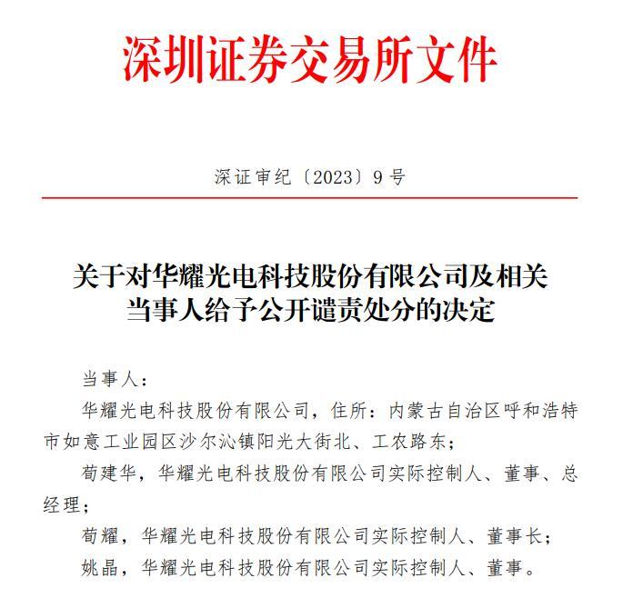 华耀光电及相关当事人被深交所给予了公开谴责处分,华耀光电IPO项目服务机构北京市君合律师事务所、中国银河证券及相关当事人则被给予了通报批评处分。