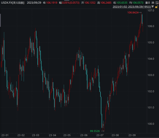 而美元指数在经历了上半年的震荡之后,三季度也重回上涨态势,全季度上涨2.72%,年初至今上涨2.61%。特别是从7月底开始,美元指数从99附近,一路上涨到近期的106。