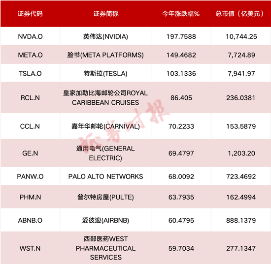 个股方面,标普500指数成份股里,科技股仍然是表现最为出色。年初至今,涨幅排名前十的有多家科技股。其中芯片巨无霸英伟达以接近两倍的涨幅领涨大盘。社交巨头Meta股价回暖明显,涨幅接近150%。此外,汽车制造商特斯拉、网络安全公司PALOALTO,旅游服务商爱彼迎等科技股股均表现不俗。而两家邮轮公司,皇家加勒比海和嘉年华则受益于后疫情旅游回暖,股价涨幅也跻身前十。涨幅前十中,仅有西部医药一家生物医药公司上榜。