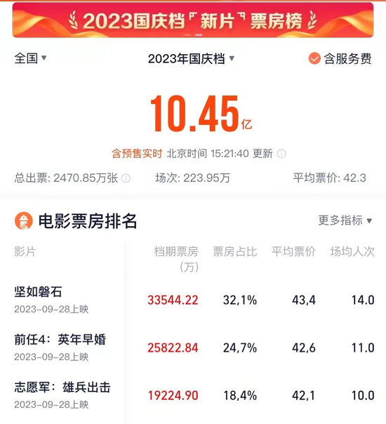 从单片票房来看,截至10月1日14:30,《坚如磐石》《前任4:英年早婚》《志愿军:雄兵出击》位列前三名,分别为3.75亿元、3.41亿元和2.11亿元。