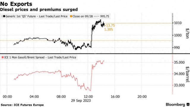 俄罗斯计划10月几乎停止柴油出口,这颠覆了交易商对禁令将很快结束的预期。俄罗斯副总理表示,如果情况没有改善,政府准备采取“严格的监管措施” 。