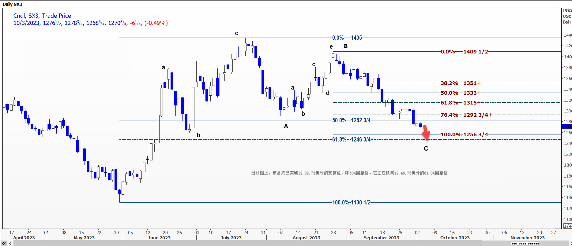 对1409.50美分的C浪的预测分析显示,略高的目标为1256.75美分,该目标区域为1246.75美分。