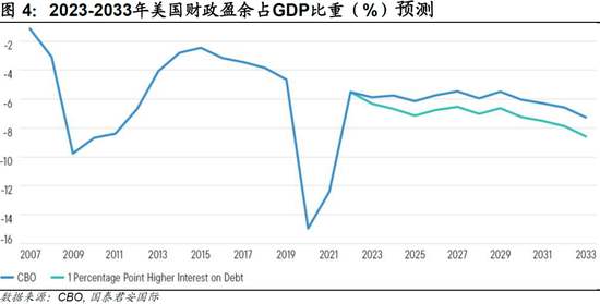 未来美债利息成本的压力或高于预期,利率上行是关键推手。针对债务利息支出,CBO预测国债净利息支出占GDP的比重将从2023年的2.5%扩大至2033年的3.7%,由此抬升财政赤字至GDP的6.5%。该预测假设未来10年平均利率约为3%,其中10年期国债收益率维持在4%以下,低于全球金融危机前十年平均利率水平1个百分点。结合实际,当前美债的平均到期期限为5.5年,而2023年以来5年期美债收益率均值在3.85%左右,明显高于CBO设定的2.6%,因此我们认为CBO的假设及其利息支出的预测相对乐观。因此,我们进行了压力测试,假设2023年政府债务展期将造成平均利率比CBO的设定高出0.5个百分点,未来10年平均利率则高出1个百分点。在这一情景下,2033年利息支出将达到GDP的5%,比CBO预测值高出近1.5个百分点。由此,2033年财政赤字将达到GDP的8.6%,超过CBO预测的7.3%。
