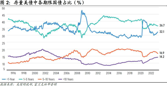 回顾低利率阶段,利息成本偏低,国债发行的偿债压力不大,美国政府压缩赤字支出的目标带来大规模国债的发行,这给当前美国政府的国债发行埋下隐患。2020年公众持有的美国联邦债务占GDP的比重高达99.8%,远超2007年的35%。相较之下,尽管2020年的债务存量增加了两倍,但净利息支出相对持平。在期限分布上,持续的低利率预期削弱政府发行长期债券必要性,2020年近70%政府存量债务的到期期限低于5年。但在当前高利率环境下,美国政府国债发行面临一个问题——债务存量庞大且不断上升,75%左右的债务需要在未来5年内展期,更高的利率水平加剧政府偿债压力。