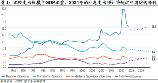 强制性支出刚性叠加利息成本不断飙升,美国超宽松财政需要发行更多国债来维系。根据CBO(美国预算办公室)的预测,美国财政赤字占GDP的比重将从2022年的5%扩大至2023年的6%左右,且这一数值尚未涵盖最新的学生贷款减免计划。往后看,不断增长的强制性支出(特别是公共安全、医疗保健支出)以及持续飙升的国债利息成本,将进一步加剧美国财政预算压力。直观地,CBO预计2031年利息支出的规模将超过非国防选择性支出(Non-defensediscretionary expenditures)。