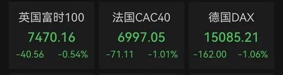 欧洲市场方面,三大股指收盘全线下跌,德国DAX指数跌1.06%报15085.21点,法国CAC40指数跌1.01%报6997.05点,英国富时100指数跌0.54%报7470.16点。