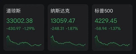 当地时间10月3日,偏紧的劳动力市场再次强化加息预期,投资者风险偏好受到打击。美股三大指数低开低走,集体收跌,截至收盘,道指收跌430.97点,跌幅1.29%,报33002.38点;标普500指数跌58.94点,跌幅1.37%,报4229.45点;纳指跌248.31点,跌幅1.87%,报13059.47点。其中,道指创3月份以来最大单日跌幅,一度失守33000点整数位。