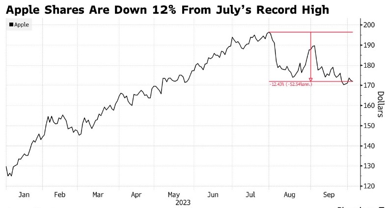 由于投资者担心智能手机需求复苏速度慢于预期,该公司股价持续回落。苹果上个月推出了新的iPhone 15系列,但没有提价。一些行业观察人士表示,此举是为了应对全球智能手机市场的低迷。研究公司Canalys的一份报告显示,北美智能手机出货量预计将在2023年下降12%。