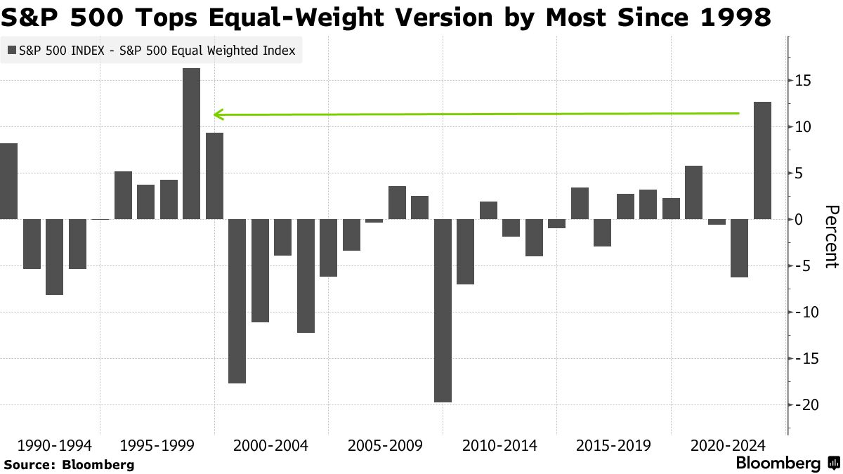 尽管标普500指数自1月初以来仍上涨了10%以上,但由于科技巨头的巨大影响力掩盖了公用事业股和电信股的疲软,标普500指数中仍有54%的股票今年至今都在下跌。在2023年,市值加权的标普500指数的表现比等权重的同类指数高出近13个百分点。如果今年结束时仍是如此,这将是自1998年互联网狂热以来差距最大的一年。