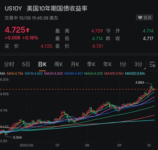 过去几个交易日以来,全球债市的抛售明显加剧,并将一些主要发达经济体的国债收益率推升到至少近10年来的新高。北京时间10月4日,有着“全球资产定价之锚”之称的10年期美债收益率逼近4.9%,30年期美债收益率上破5%,均创2007年以来新高。截至目前,这二者仍处于高位震荡的态势。