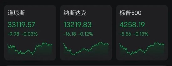 美国三大股指小幅收跌,截至收盘,道指跌0.03%报33119.57点,标普500指数跌0.13%报4258.19点,纳指跌0.12%报13219.83点。
