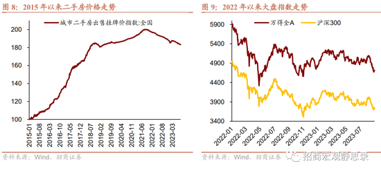 原因之二是居民财富效应受到抑制。房地产占居民资产超六成,2021年下半年以来,城市二手房出售挂牌价指数下降了约8%。金融资产方面,2022年以来股票指数表现偏弱,万得全A与沪深300有不同程度的下跌。