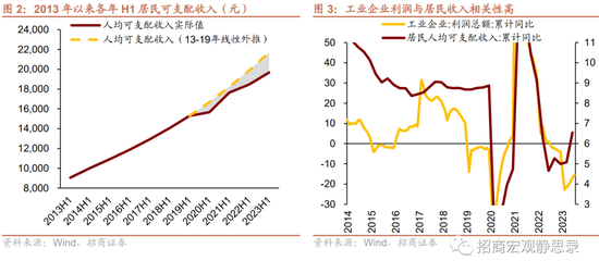 居民可支配收入的增长路径仍较此前放缓。今年上半年,居民可支配收入增速较2022年全年的5.0%回升至6.5%,同时低于2019年的8.9%。沿着2013-2019年上半年的居民可支配收入路径外推,可见今年上半年增长仍然偏缓。
