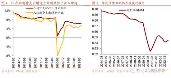 消费倾向下降体现为每单位收入形成的支出减少。从居民收支增速看,疫情之前,居民可支配收入与消费支出增速比较接近;疫情以来,消费支出增速开始明显低于收入增速。用居民“消费性支出/可支配收入”衡量消费倾向,可见防疫平稳转段以来,居民消费倾向已经有所恢复,但仍低于疫情之前和2021年。