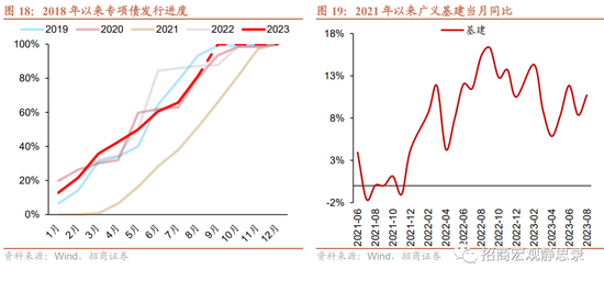 二是专项债发行提速有望稳定基建投资。2023年的新增专项债额度为3.8万亿元,截止8月底发行3.1万亿元,剩余0.7万亿元,其中8月当月发行6007亿,较此前明显提速。如果后续足额发行完毕,将有利于稳定基建投资增速,以及行业对就业的吸纳。从基建支出的视角看,随着8月专项债发行提速,8月基建相关财政支出(城乡社区、农林水事务、交通运输)同比增速较高,广义基建当月同比也边际回暖,两年同比达10.7%(前值8.4%)。