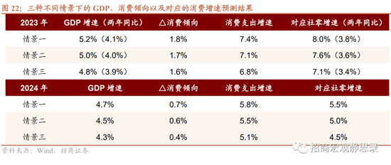 在内生动能与政策因素下,我们对后续消费复苏持乐观态度。在政策助力之外,基于下一阶段的GDP(影响企业利润和居民收入)、楼市和股市(影响财富效应和消费倾向)表现,我们假设了消费内生性恢复的三个情景。定量估算,预计今年全年社零增速在7.1-8.0%,对应两年同比增速3.4-3.8%;如果上述内生动能和政策支持能够延续,明年增速有望进一步恢复至4.5%-5.5%。