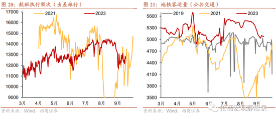 三是消费服务业流量恢复到较高水平。高频数据显示,国内航班执行架次和地铁客运量等数据恢复良好,其中航运交通恢复至2021年水平,地铁客运量高于2019年水平,预计后续保持在较高水平。根据去哪儿旅行平台数据,截止9月15日,国庆假期的国内热门酒店预定量较2019年同期增长514%, 且机票预售节奏也快于今年“五一”与端午节,对相关旅游地的消费有显著拉动作用。