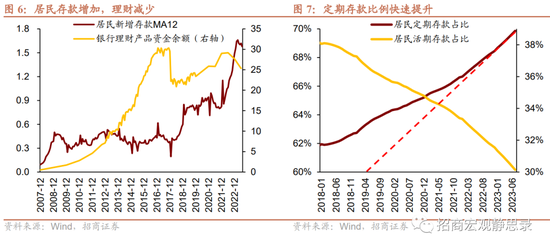 原因之一是居民风险偏好仍在恢复。居民的可支配收入可被用于消费支出、金融投资支出与非金融投资支出。今年以来,居民降低了不动产与理财产品的配置比例,同时增配了大量存款。存款结构上,定期存款占比的上升斜率有所提升,而近70%的居民存款以定期形式沉淀在银行,意味着短期内难以激活成为消费或投资。