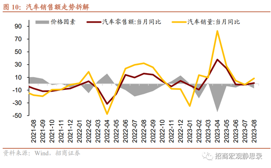 以汽车行业为例,今年汽车行业存在多个降价去库因素,例如制造成本下行、上游材料价格下行、库存压力高企以及补贴退坡等。因此特斯拉在1月率先下调售价,幅度达2万-4.8万元,随后国内新能源车企相继跟进降价策略。叠加今年6月排放标准的切换,降价潮同时波及燃油车企业。如果将销售额同比拆分为销量因素与价格因素,不难发现今年以来价格对汽车销售额的贡献始终为负,即说明今年汽车消费额复苏走势一定程度受到车企定价策略的影响。
