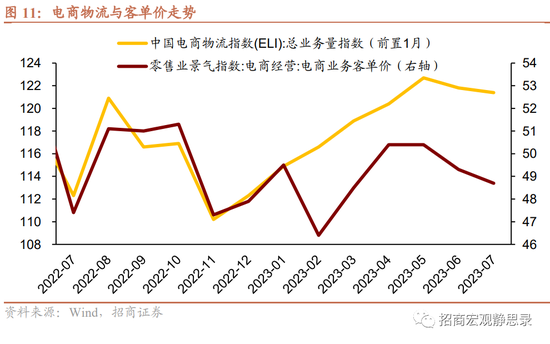 再比如电商平台,今年以来,各大电商平台相继推出降价策略以竞争市场份额,例如京东上线“百亿补贴”,并将其设置为固定活动频道,补贴范围更广,降价更为直接,优惠程度对标拼多多;抖音和快手也分别推出“超值购”与“敢比价”等补贴栏目。从数据上看,2023年2月之前,客单价与快递业务量高度正相关,去年客单价下降可能是因为居民部门对电商总体需求下滑,消费意愿不强。然而随着今年的电商业务回暖,客单价并未同步复苏,反而于4月见顶,并持续下降至7月,因此不难看出,电商平台主动的降价策略是影响消费总额的一个重要因素。
