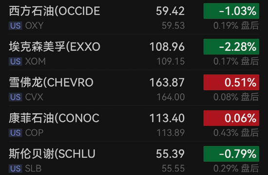 能源股涨跌互现,埃克森美孚跌2.28%,雪佛龙涨0.51%,康菲石油涨0.06%,斯伦贝谢跌0.79%,西方石油跌1.03%。